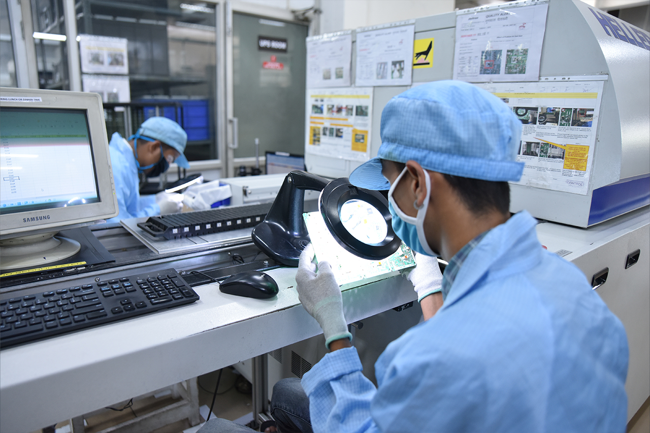 We offer printed circuit board (PCB) assembly services, starting from prototyping, new product launches to regular production ramp ups, out of different production sites. Our facilities have several SMT lines. We produce boards in varied sizes using various types of substrate boards. In addition, we offer wave soldering, conformal (manual/automatic) coating with multi-nozzle spray, UV check chamber, and solder paste inspection.